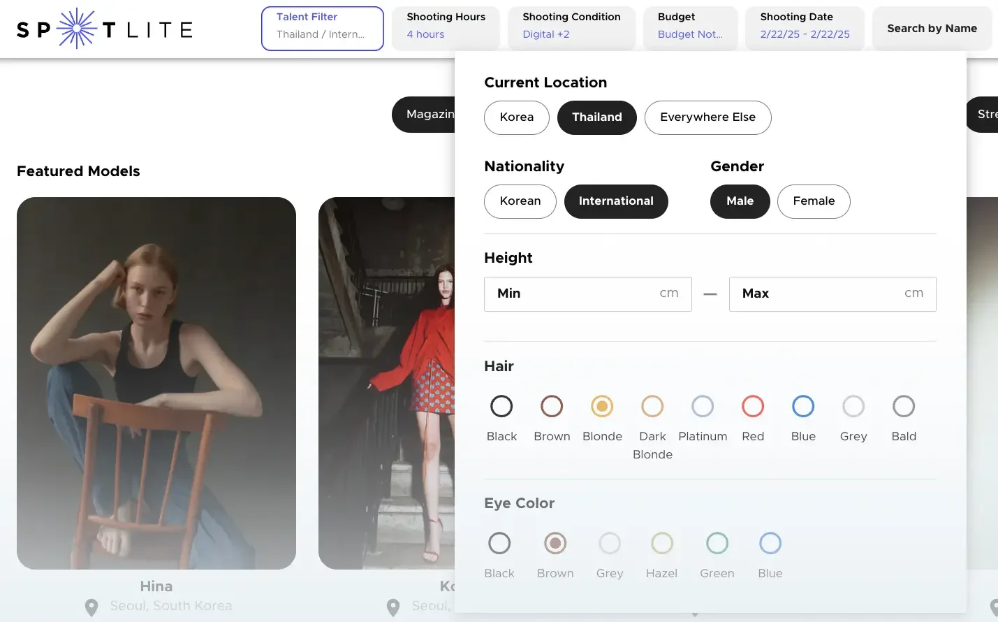 ด้วย Spotlite ผู้ใช้สามารถกรองโมเดลตามความสูง, สัญชาติ, สีตา และเกณฑ์ อื่นๆ เพื่อค้นหาและจ้างโมเดลที่เหมาะสมได้อย่างรวดเร็ว โมเดลแต่ละคนยัง สามารถอัปโหลดผลงานของตัวเองและรับคำขอการจองตรงจากแบรนด์ ซึ่งช่วย ให้การร่วมงานมีความยืดหยุ่นมากยิ่งขึ้น
